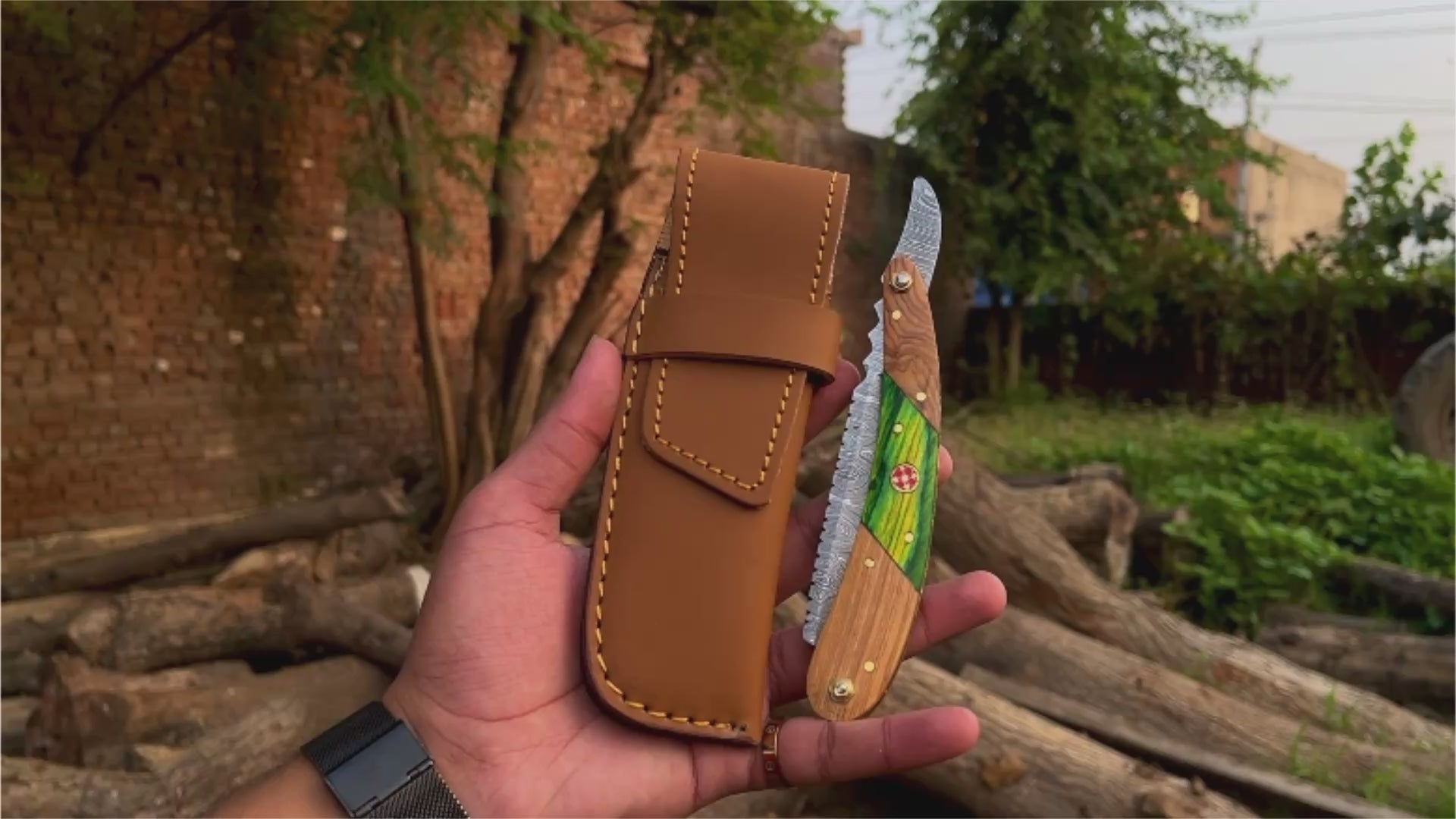 Damascus Folding Pocket Knife – Custom Steel Blade with Multicolor Wood Handle EDC Camping Knife with Leather Pouch.Damascus Folding Pocket Knife – Custom Steel Blade with Multicolor Wood Handle EDC Camping Knife with Leather Pouch.